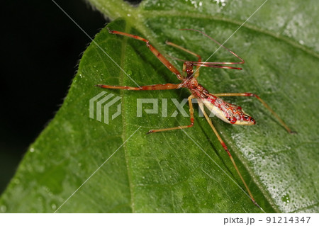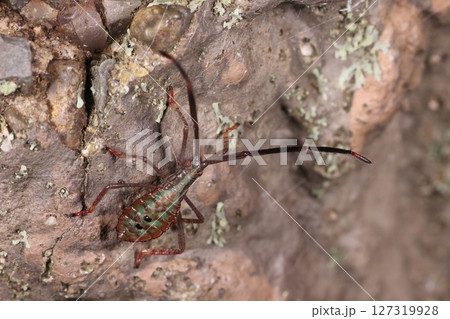 生き物 昆虫 オオクモヘリカメムシ、幼虫です。立派な触角と背中の赤い模様、中齢幼虫の様です