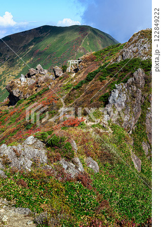 登山道に建つ鳥居 谷川連峰 秋の山岳風景
