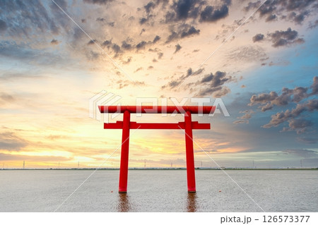 「茨城県」鹿島神宮一之鳥居の風景 空合成 鹿嶋市