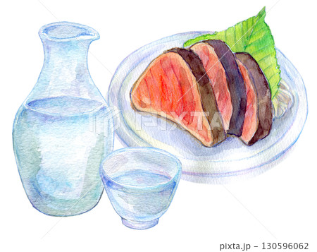 水彩イラスト 手描きイラスト 鰹のタタキと冷酒