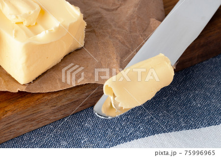 cut block butter on a whitw wooden table, selective focus. Stick of butter, cut.