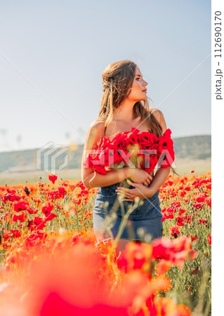 Woman poppies field. portrait happy woman with long hair in a poppy field and enjoying the beauty of nature in a warm summer day.