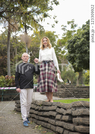 Charming elderly man and woman standing on urban paved street, holding coffee cups and loving looking at each other. Happy senior couple enjoying sunny day together during summer walking.