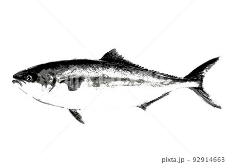 ブリとヒラマサを交配させた養殖魚 "ブリヒラ” モノトーン【水墨画風イラスト】白バック