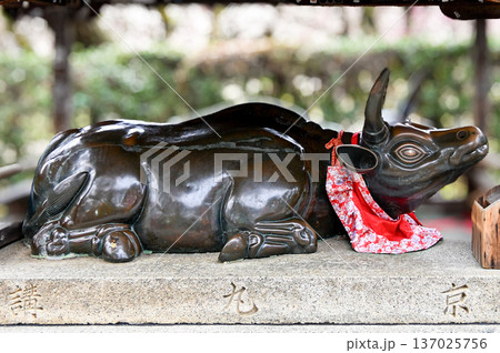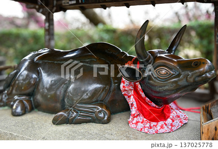 春の京都「北野天満宮」紅梅と赤いよだれ掛けを付けた撫で牛