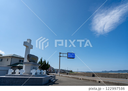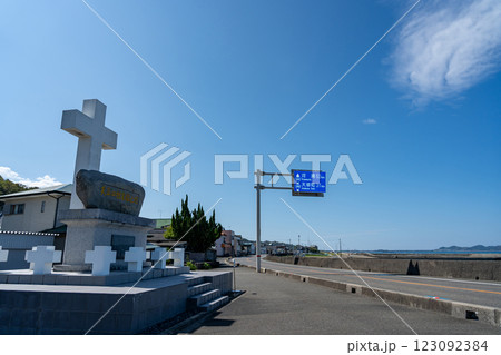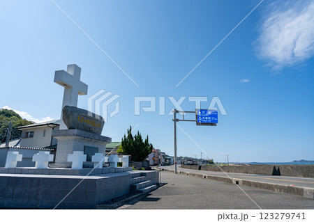 熊本県天草郡苓北町 天草四郎が率いる一揆軍の猛攻撃にも落城しなかった富岡城の遠景と麓の神社の鳥居