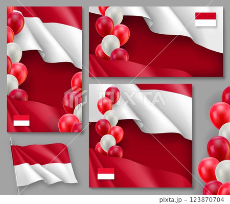 Indonesian patriotic festive posters. Realistic waving indonesian flag and colorful air balloons on red backdrop. Independence and freedom vector layouts. Indonesia country national celebration