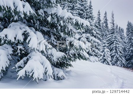 Scenic image of spruces tree. Location Carpathian, Ukraine, Europe.