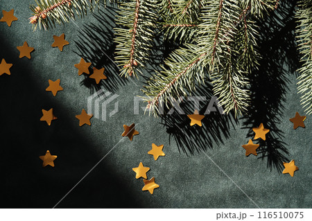 Abstract green velvet Christmas background with Christmas tree branches and gold stars.