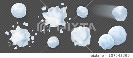 3D snowballs. Throw snow balls. Winter game. Christmas fight. Play with ice snowflakes. New Year holiday. Snowy sphere fly motion. Icy orb splash. Vector realistic frost elements set