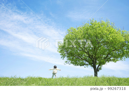 晴れた日の一本木のある原っぱで手を広げて立つ子供