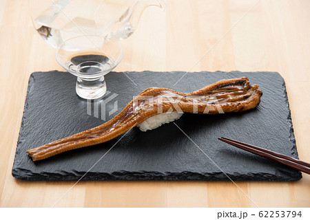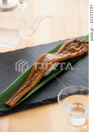 寿司下駄の上の穴子一本握りとお茶