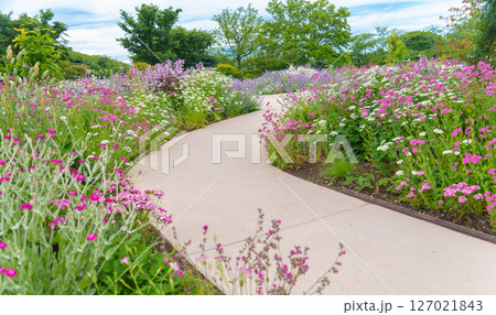 様々な草や花が咲き乱れる庭園の遊歩道(神奈川県綾瀬市 光綾公園「あやせローズガーデン」)
