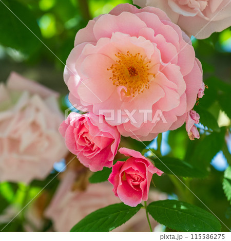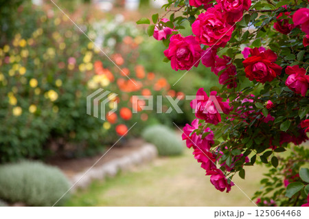 薔薇園に咲くあでやかなピンク色の薔薇の花