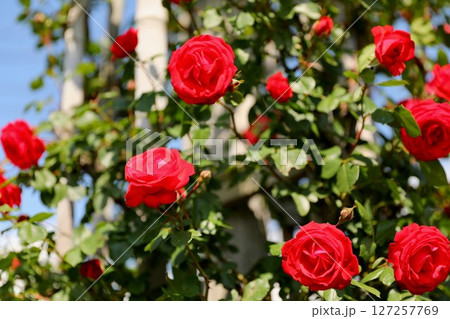 青空に映える満開の赤いバラ