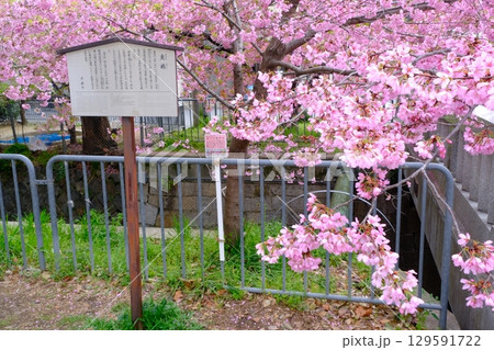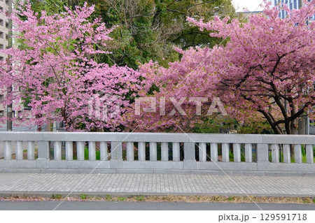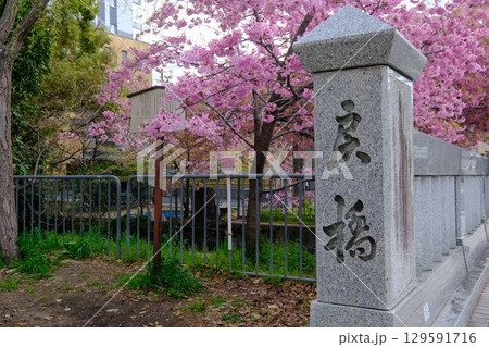 京都市上京区堀川下之町の一条戻橋に咲く春を告げる河津桜を撮影
