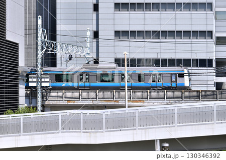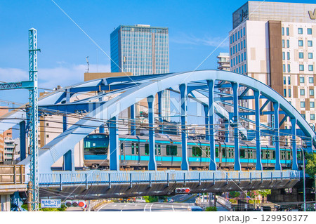 日本の東京都市景観 京浜東北・根岸線(先頭車両)などを望む。奥にベースゲート横浜関内タワー