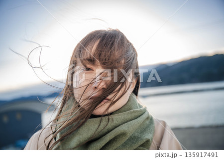 湖と夕陽 マフラーをした若い女性