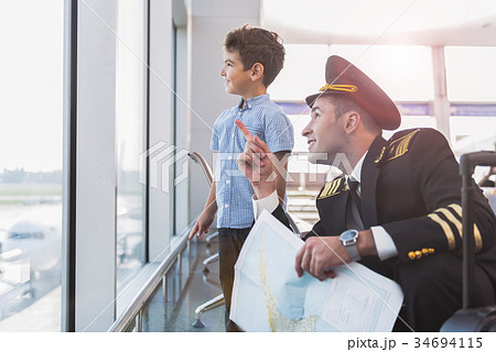 Happy smiling pilot spending time with child