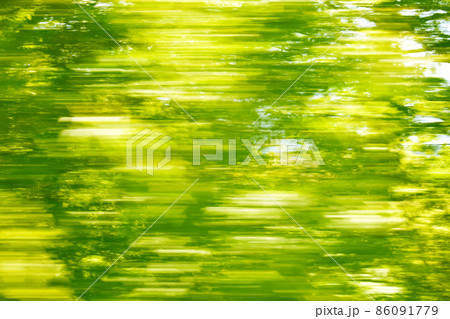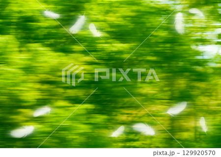 流れる緑を背景に舞い飛ぶ、白い鳥の羽