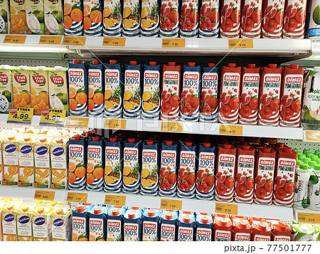 PENANG, MALAYSIA -JUNE 25, 2020: Selected focused on fruit juices sold in commercial paper pack and bottles. Displayed on the chiller rack. Placed a price tag for the customer.