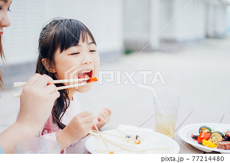 笑顔で美味しい食事や料理をいただきますする親子(ママと子供)のイメージ