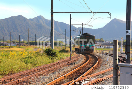 鉄道車両が走る日野川の鉄橋と大山の風景