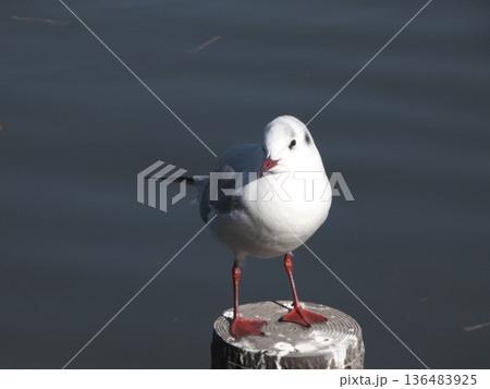 杭の上に佇みこちらを見つめるユリカモメのポートレート