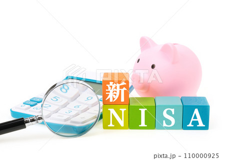 NISAイメージ カラフルな積み木と豚の貯金箱と電卓と虫眼鏡