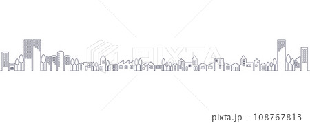 クレヨンタッチのシンプルな黒い線で描いた街並みと山並みとビル街