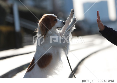 飼主さんとハイタッチする中型犬コーイケルホンディエ