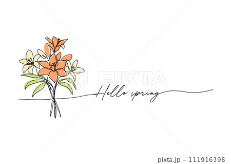 Hello spring, bouquet of lily line art drawing, One continuous line drawing and text. for postcard design