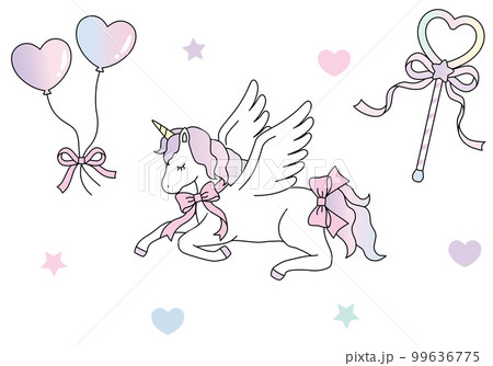 リボンをつけたかわいいユニコーンとハートバルーン 魔法のステッキ ゆめかわ イラスト素材