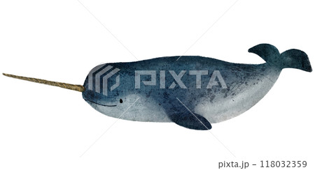 Watercolor hand drawn illustration of nawhal whale with horn tooth. Sea ocean marine wildlife endangered species, undersea creature fish, wild nature ecology.