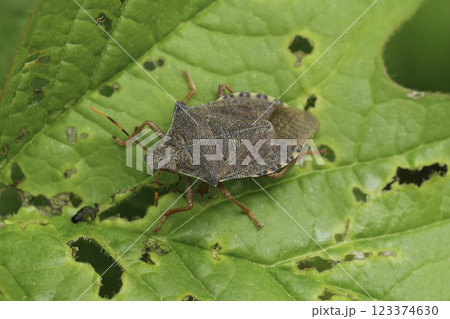 Closeup on the brown colored Dock leaf bug, Arma custos sitting on a green leaf