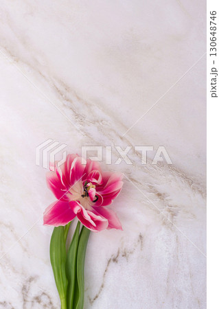 Vibrant pink tulip on marble surface with green leaves