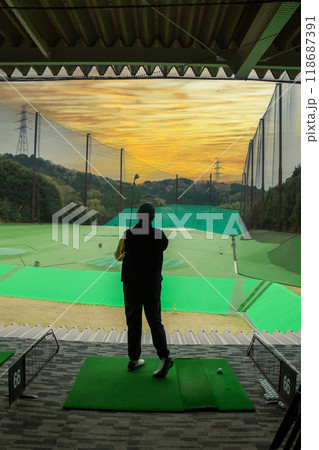 山の中のゴルフ練習場でボールの行方を確認するシニア男性