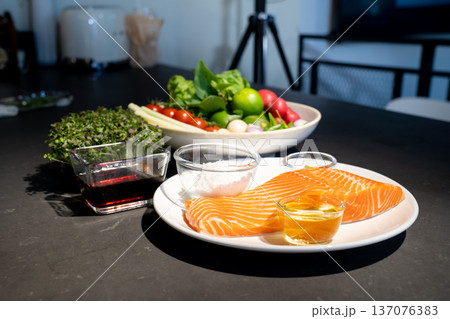 Ingredients of Spicy Raw Salmon are prepared on granite top table such as lemonglass tomato lemon garlic chilli salt oil and wasabi on dishes.