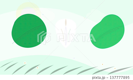 Light mint abstract background with garlic clove between two large leaves and grass details on flowing wave composition