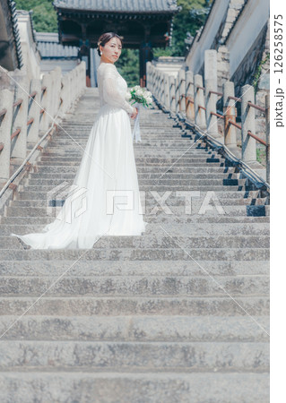石段の上に立つウェディングドレス姿の女性