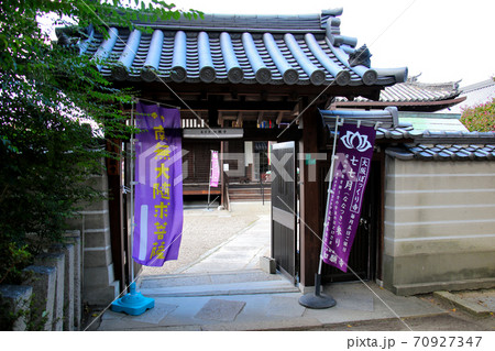 大阪・平野区喜連環濠都市の街歩きで見つけた大阪ぽっくり寺、如願寺の神社との間にある山門 別アングル