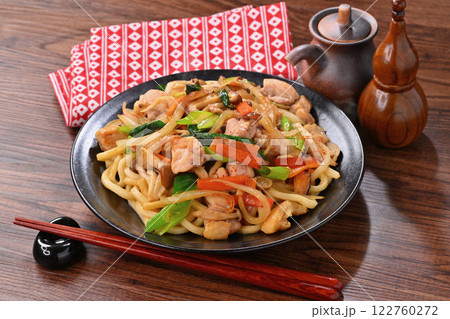 焼きうどん、具材は、タマネギ、鶏モモ肉、シイタケ、シメジ、ニンジン、九条ネギ。顆粒だしと醤油味。