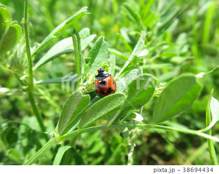 春の緑、クローバーの葉の上を歩くテントウムシ