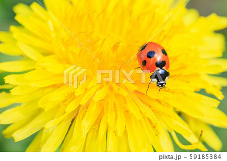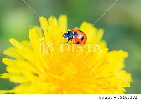 タンポポにとまるナナホシテントウ
