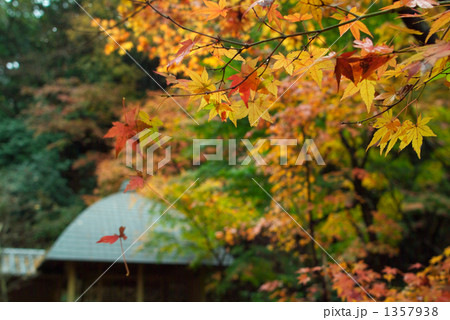 神奈川県立七沢森林公園 せせらぎ広場の寸草亭と紅葉