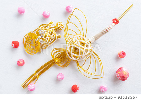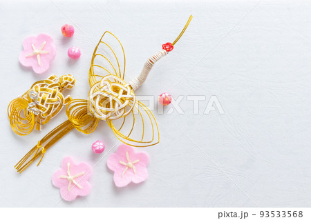 年賀状素材・水引亀甲とアートフラワー松が枝・和紙2種バック横位置アップ・ハガキ対応比