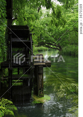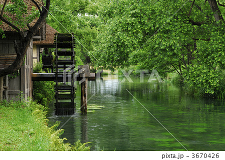 新緑あふれる大王わさび農場の万水川と水車小屋