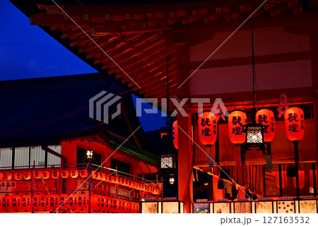 滋賀県、多賀大社で行われる万灯祭の提灯と境内の舞殿