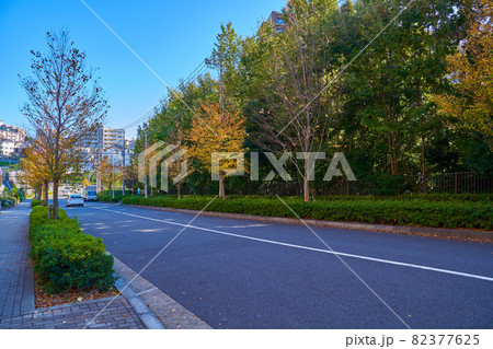 秋の神奈川県川崎市麻生区 新百合山手中央通りの歩道を北側(万福寺6,4丁目など)に見る