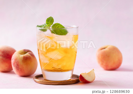 Iced peach tea with mint leaf in glass and fresh peaches on pink background, Summer drink